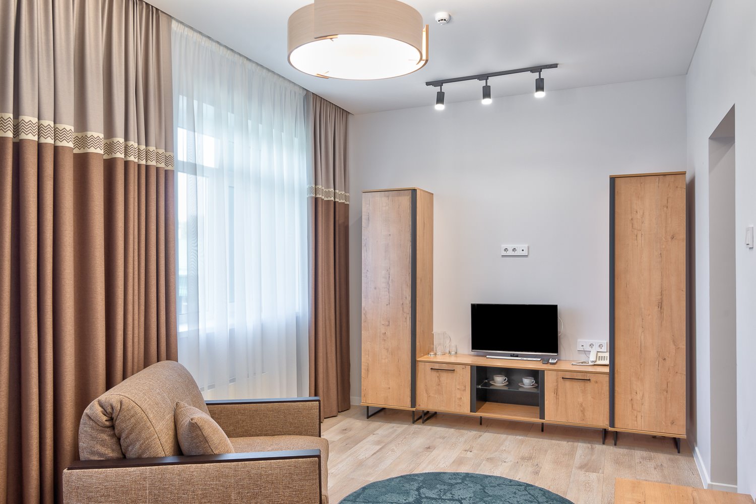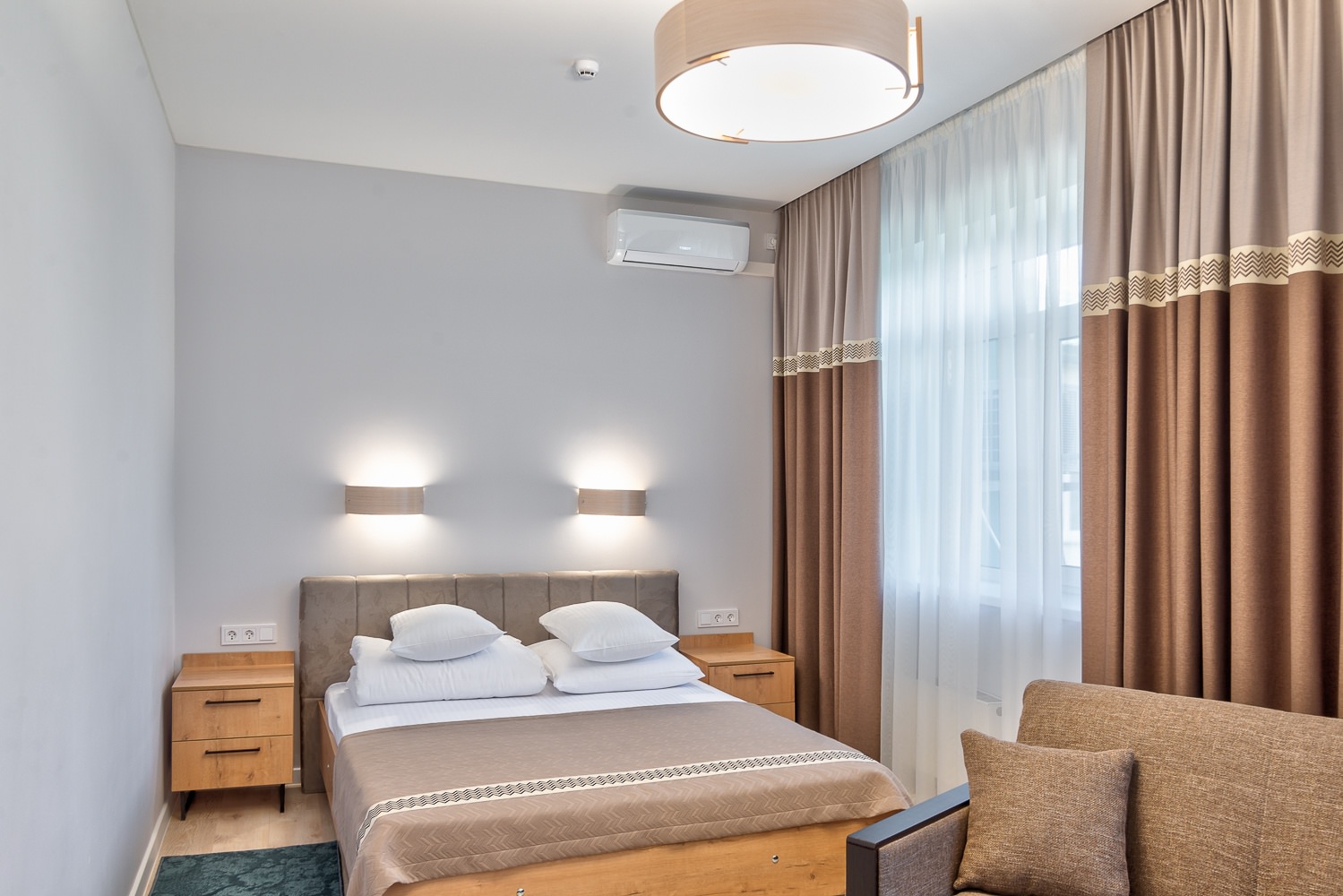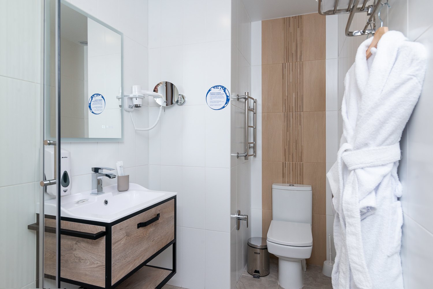 Площадь номера - 15-25 кв.м. 2 осн. места. 1 доп. место. Мебель: кресло-кровать, кровать двуспальная, прикроватные тумбочки, тумба под телевизор, шкаф. Оборудование: набор посуды, телевизор, телефон, холодильник. Санузел: с душевой кабиной, тапочки, туалетные принадлежности, фен, халат. Сервис: Wi-Fi бесплатно, смена полотенец, смена постельного белья, уборка номера, услуги внутренней телефонной связи.